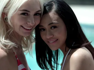 Bikini clad babes Chloe Temple and Jasmine Grey join forces to seduce their lover into a pussy pounding threesome