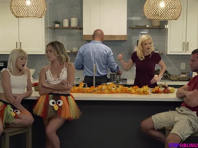 It's Thanksgiving time and Katie Kush and her stepbrother Seth Gamble are ready to celebrate with their parents, Andres Mclovin and Serene Siren. Katie has even been allowed to invite her friend, Jessie Saint, for dinner. The girls are dressed in their holiday costumes for school. Serene asks Seth to put on his costume. He refuses, so Serene tells him to stuff the turkey instead. Seth claims he doesn't know how, so Serene kicks all three kids out of the kitchen and tells them to come back in an hour with the knowledge of what to do. Relocating to the bedroom, Seth pulls up online videos while Jessie offers to just show him how to do it. Seth is a jerk, so the girls make a plan to fuck with him.Undressing Jessie, Katie lays her out on the bed so that she's nice and naked and ready for Seth to stuff her. Jessie tells Seth that first he needs to take the giblets out. He can practice by finger banging her. The girls tell Seth that next he needs something to stuff in. They point out that Seth's dick is already hard so he can use that. It takes a second to convince Seth that this is the right call, but Katie helps Seth whip it out and shove it into Jessie's snatch. At first, Katie is only trying to get her friend laid. As Seth keeps pounding Jessie right, though, Katie decides she wants some of that D for herself.Getting on her knees on the bed, Katie moans in delight as Seth stuffs her, too. She leans forward and eats Jessie out as she's getting fucked, making sure that Jessie's good times keep rolling. Next Seth lays on the bed so Jessie can climb on top and ride his dick in reverse cowgirl. Katie gets another shot at the D when she takes Jessie's place and rides Seth. Her position lets her once again lean forward to eat her friend out even as her hips set an orgasmic rhythm. Finally sated, the girls work together to blow Seth until he delivers a cumshot that they can both enjoy together.