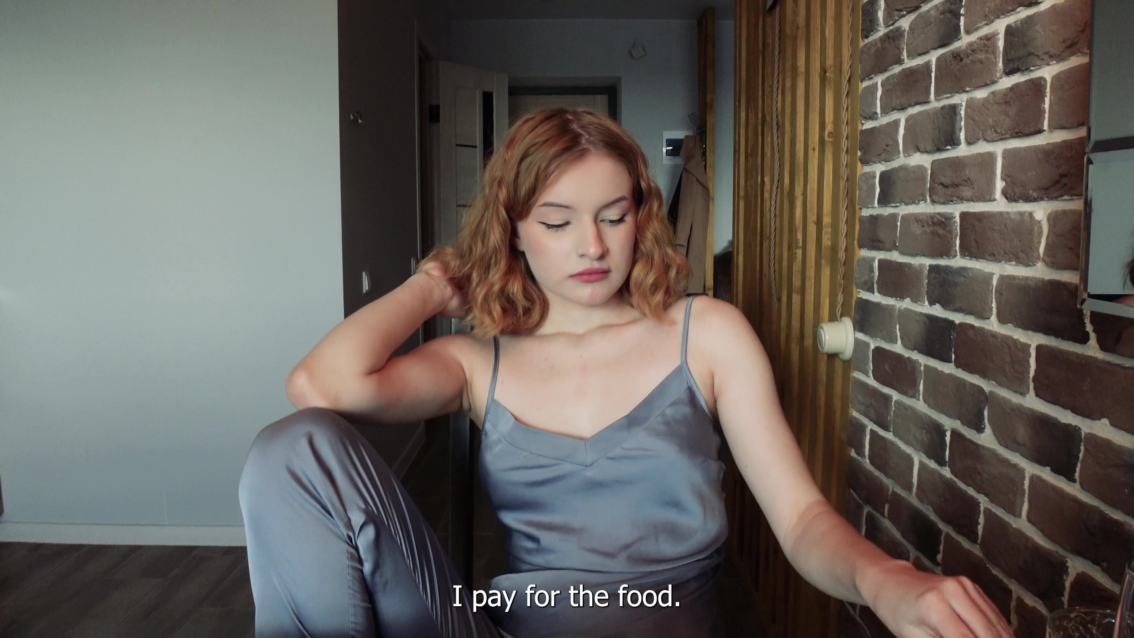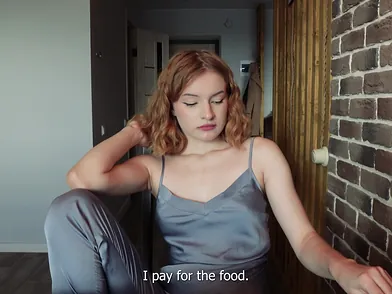 A step-sister lives with her stepbrother in the same room, but she does not pay rent or buy groceries. He is sick of it and the sister in law has to pay, but she has no cash and offers her fuckbox